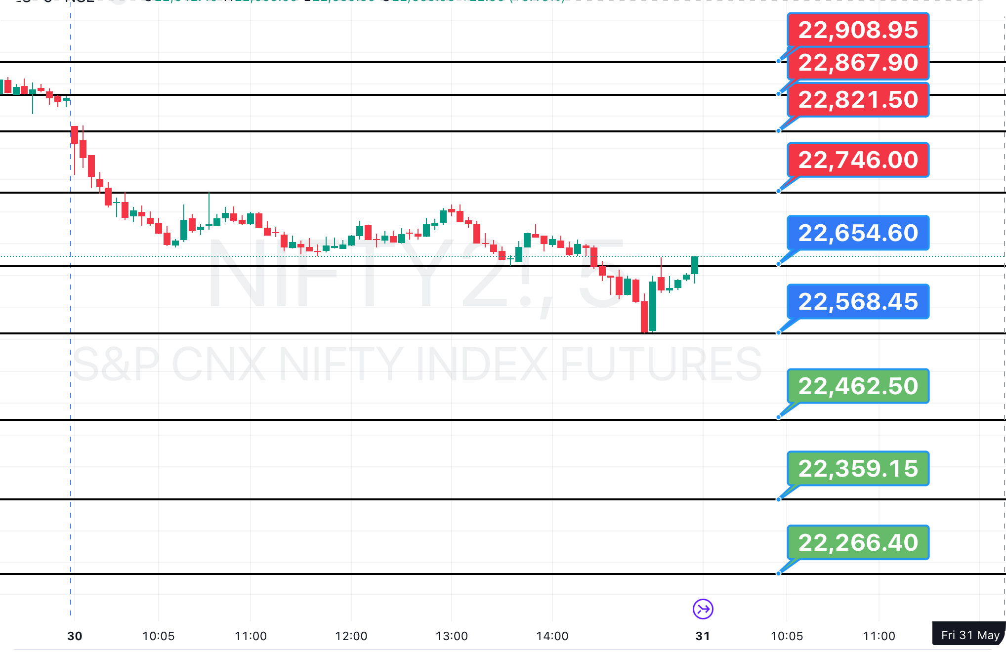 Bullish above 22654 and Bearish below 22568. Please note that these levels are plotted in the Nifty Futures chart. To know how to use the key level system, please check this post.