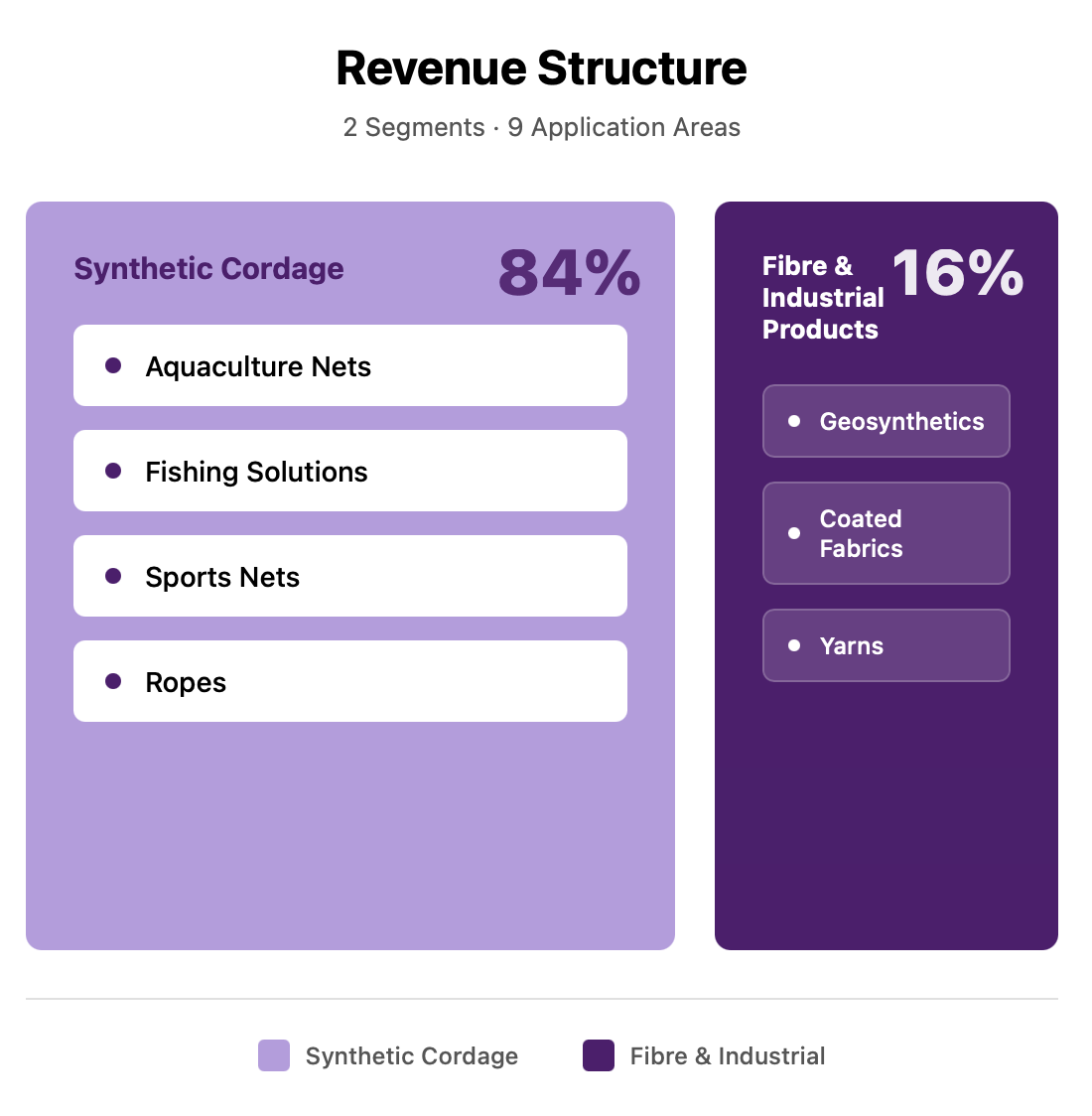 Capacity is modular by design, allowing reallocation between product segments. When aquaculture demand softens, the same equipment can produce fishing nets or sports products. This flexibility prevents the boom-bust cycles that plague specialized manufacturers.