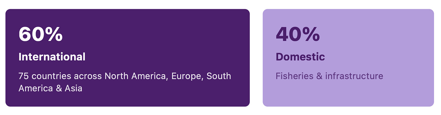 Domestic business provides 40%, anchored in fisheries and infrastructure. This 60/40 split has remained remarkably stable from 2022 to 2024, demonstrating balanced portfolio management.