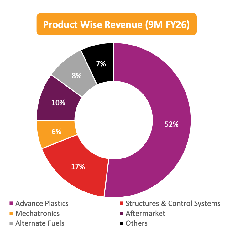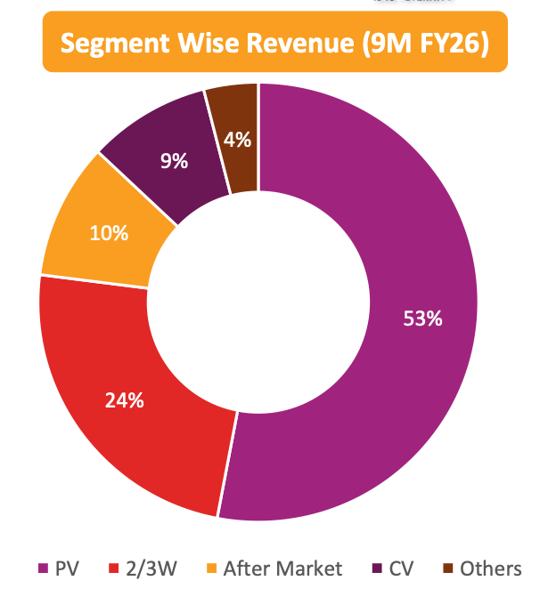 Passenger vehicles contribute 53% of 9M FY26 revenue. Two-wheelers add 24% and aftermarket 10%. Commercial vehicles contribute 9%. This spread insulates the company from category-specific slowdowns. Balance is built into the structure.