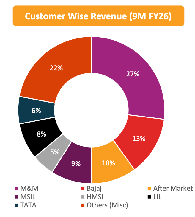 Maruti Suzuki accounts for 9% of 9M FY26 revenue. Revenue is also spread across Tata, Honda, and Hyundai.