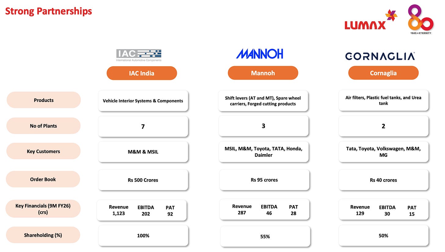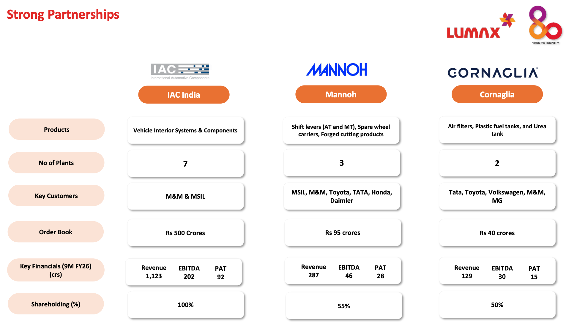 Cornaglia from Italy is a 50% JV for air intake and emission control systems. It generated ₹129 crore revenue and ₹30 crore EBITDA in 9M FY26.