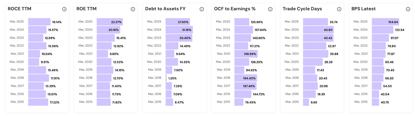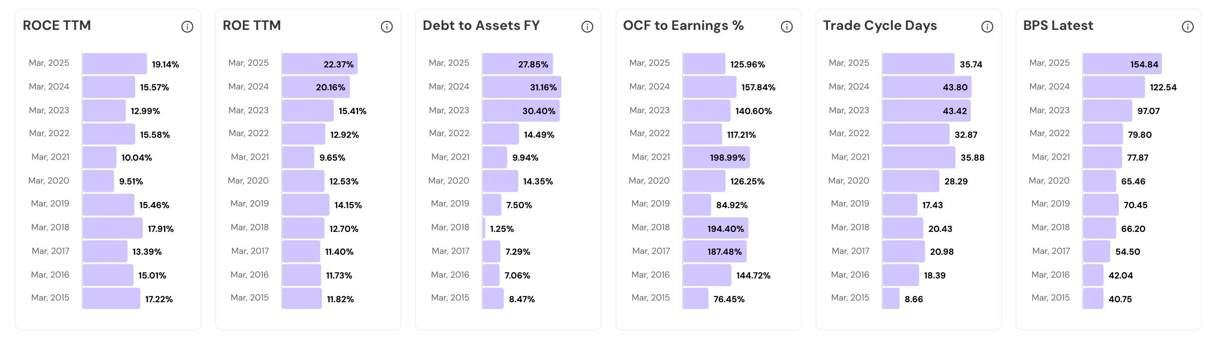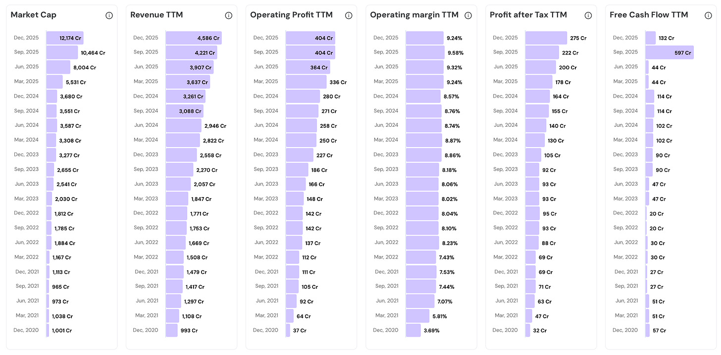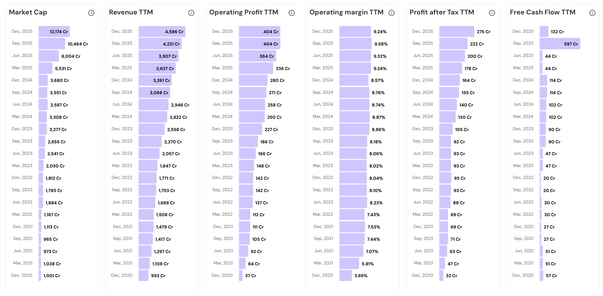 Operating margins expanded from 7% in FY21 to 9.5% in FY25. Scaling and margin expansion happening together. That combination is worth noting.