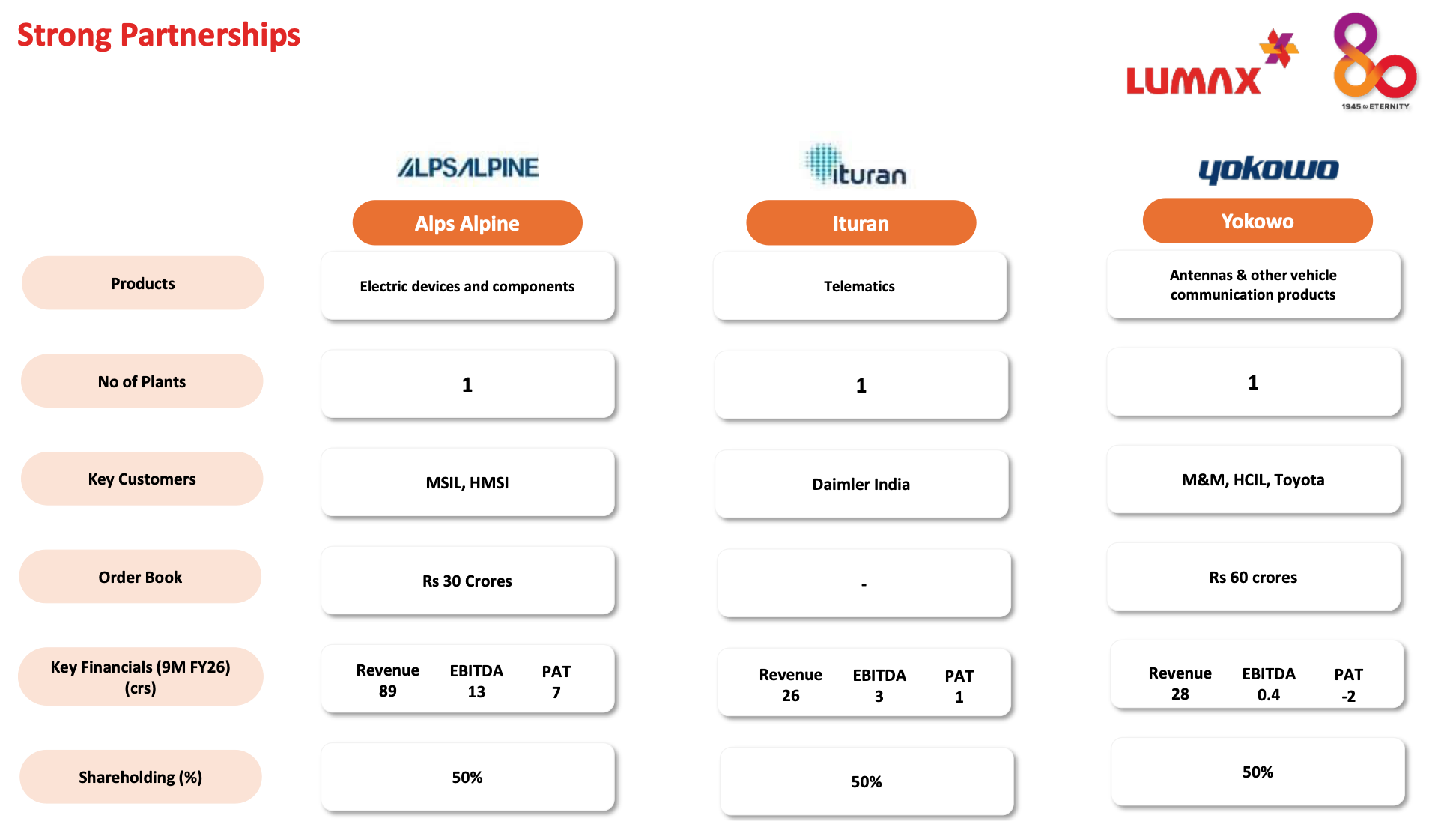 Lumax Alps Alpine India is a 50% JV with a Japanese electronics company. It generated ₹89 crore revenue and ₹13 crore EBITDA in 9M FY26.