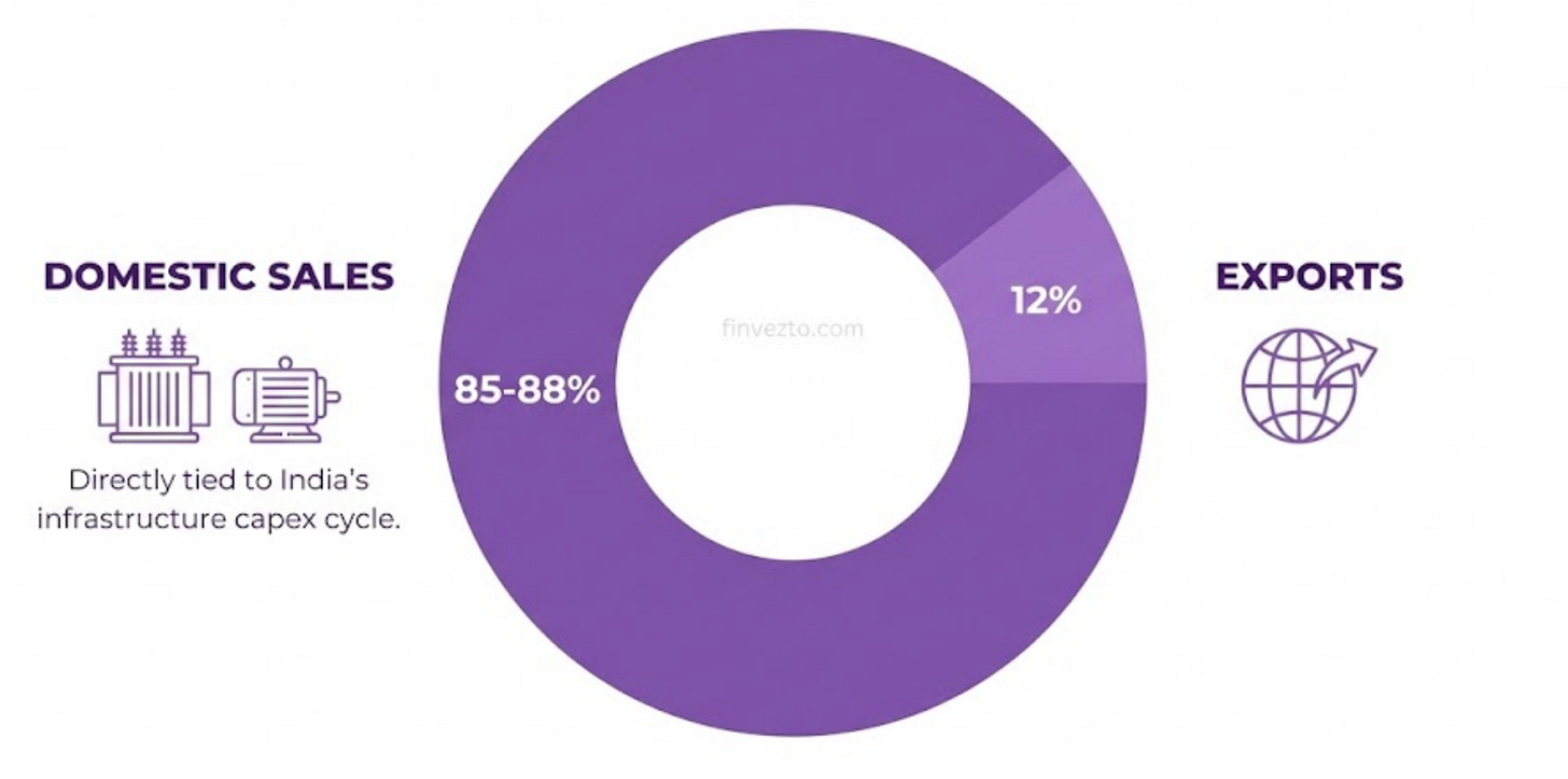 Domestic sales at 85-88% of revenue are directly tied to India’s infrastructure capex cycle. Every new transformer or motor is a sale for PWIL.