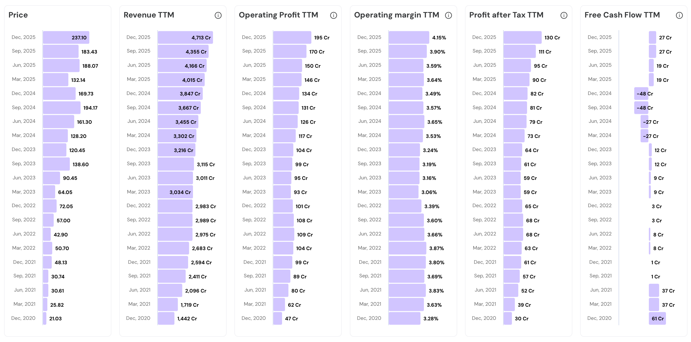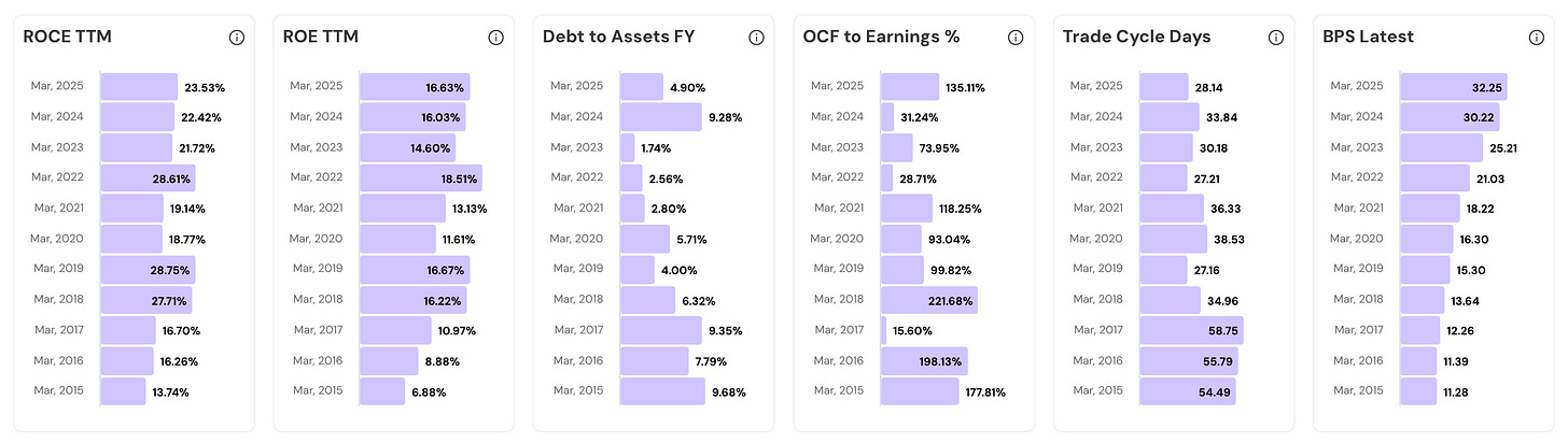 Interest expense has been rising steadily. It moved from ₹25 crore in FY22 to ₹47 crore in FY25 and ₹56 crore in trailing twelve months. Higher copper prices inflate working capital finance costs.