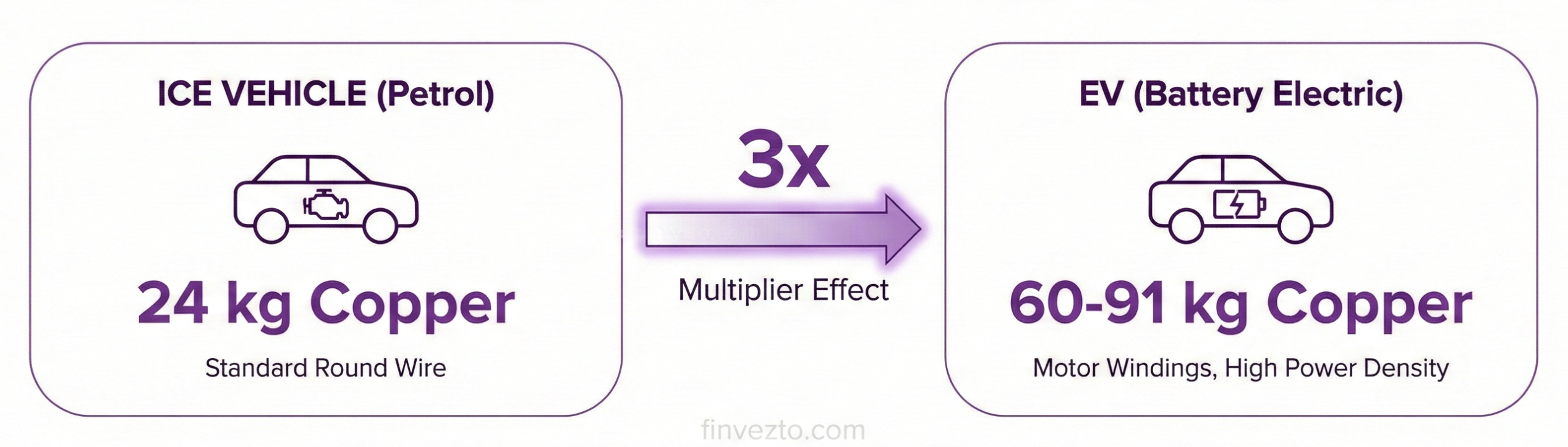 A battery electric vehicle uses 60 to 91 kg of copper versus 24 kg in a conventional petrol car. Motor windings account for the bulk of this jump. For every car switching to EV, PWIL’s revenue potential per vehicle triples.