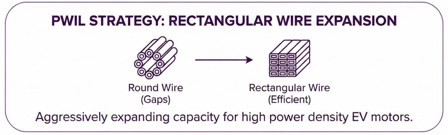 EV motors require rectangular (flat) wires for high power density. Round wires leave gaps when wound into tight spaces. PWIL is aggressively expanding enamelled rectangular wire capacity to serve this specific demand.