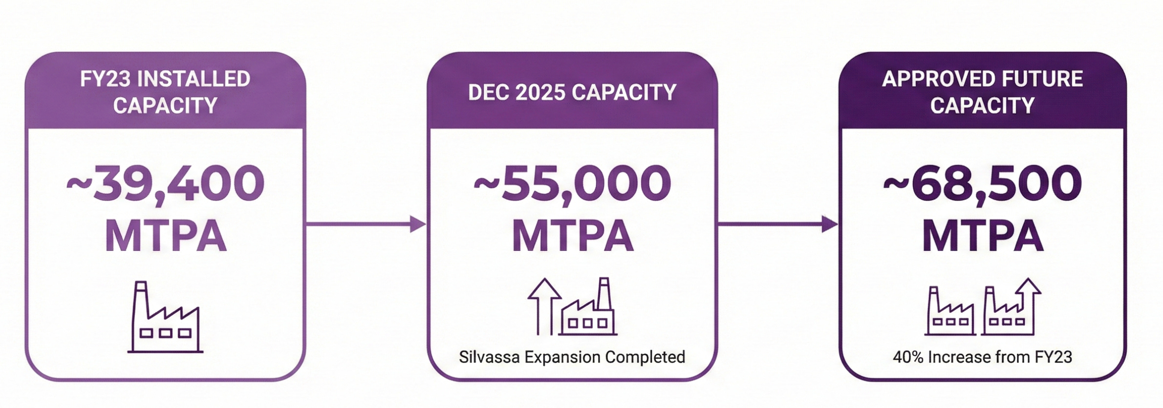 Installed capacity grew from ~39,400 MTPA in FY23 to ~55,000 MTPA by December 2025. A ~6,000 MTPA expansion at Silvassa was completed on schedule. This indicates execution competence.