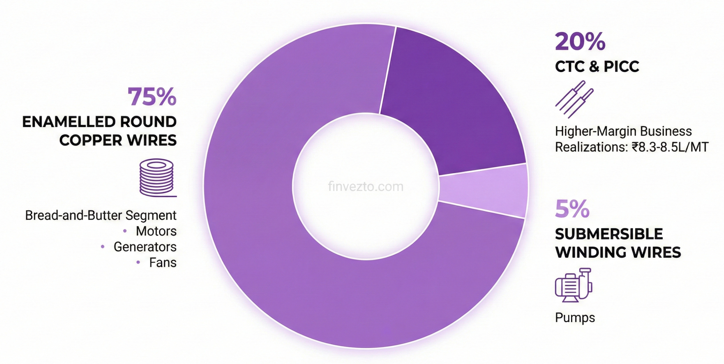 Enamelled round copper winding wires form ~75% of revenue. They serve motors, generators, fans, compressors, and distribution transformers. This is the bread-and-butter segment.