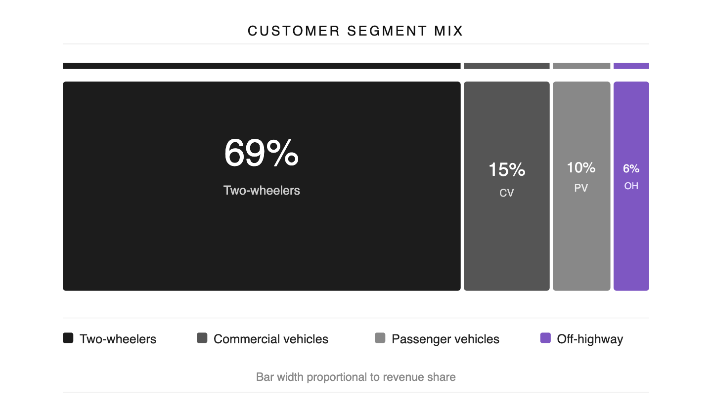 Two-wheelers form the largest customer segment at 69% of revenue.
