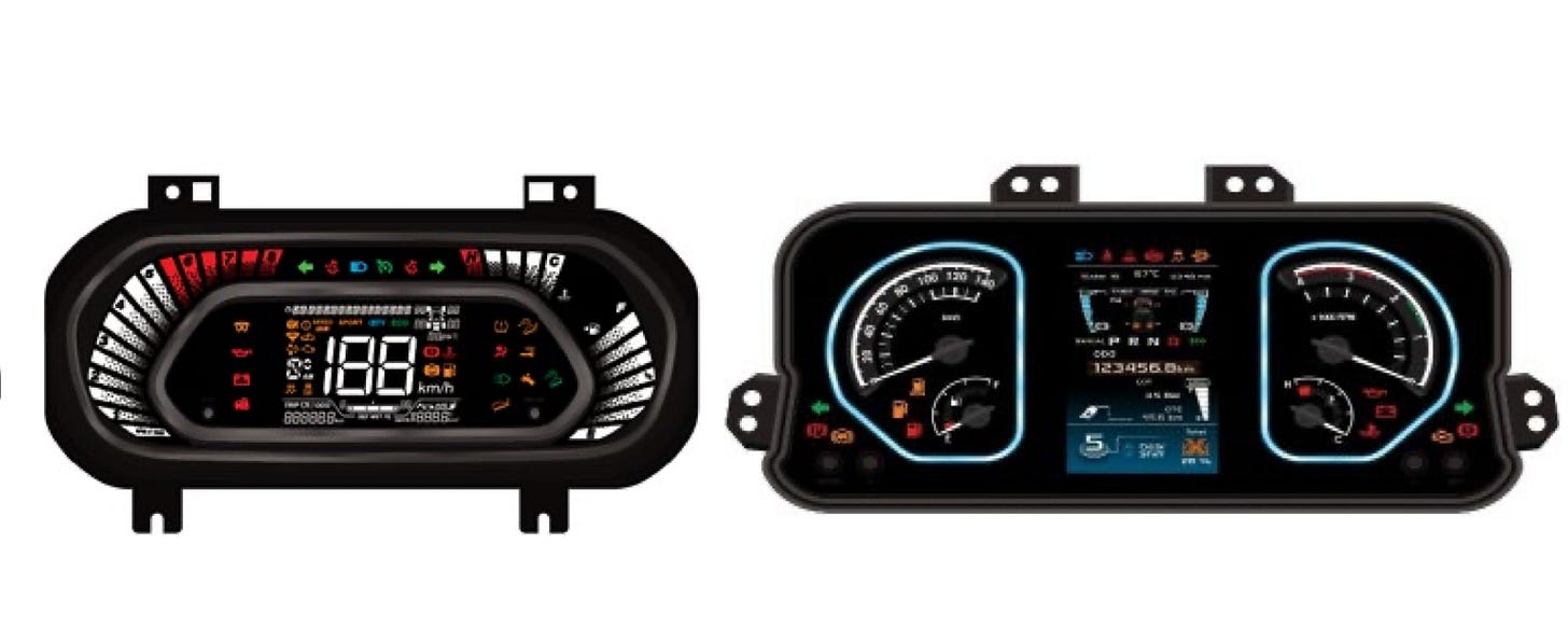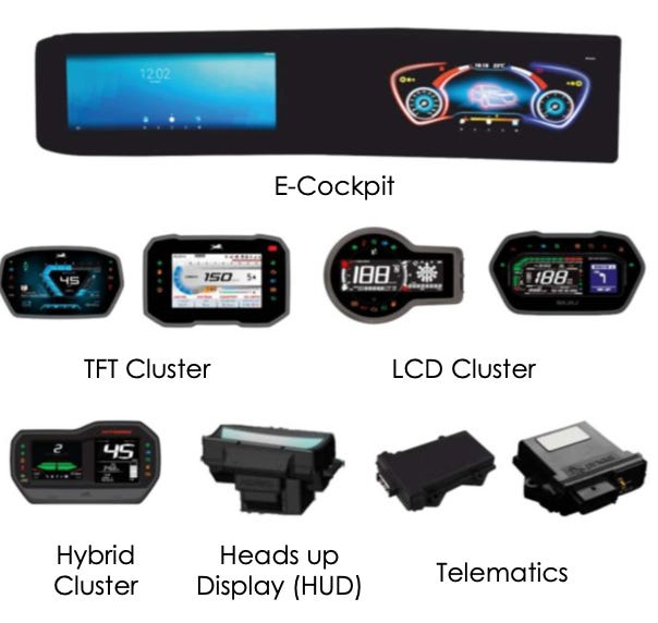 Average realization per instrument cluster rose from approximately ₹800 to ₹2,500 in recent years. The shift from basic LCD to full TFT technology is the primary driver.