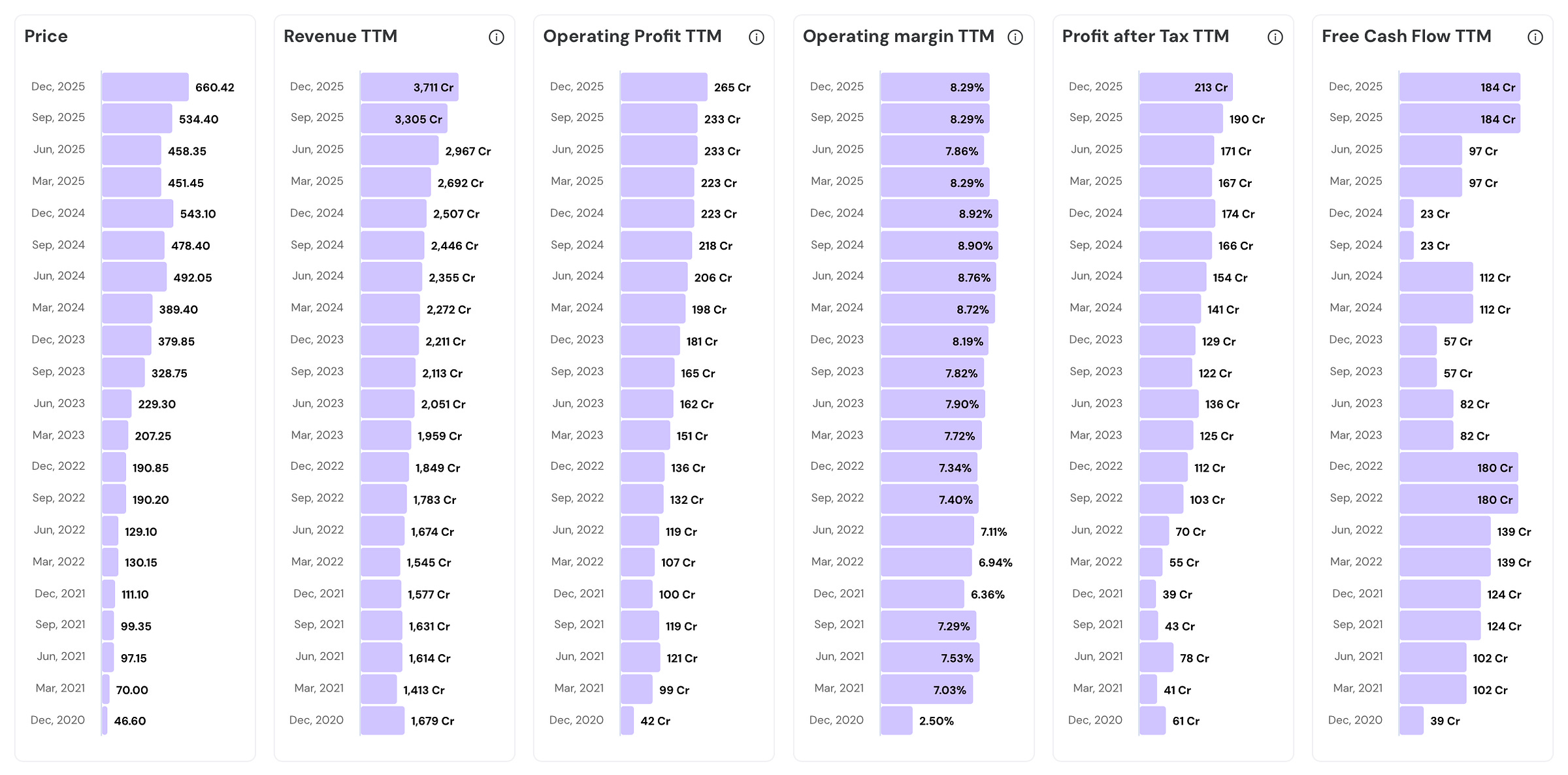 - Revenue TTM has grown 2.2x (from ₹1,679 Cr to ₹3,711 Cr)