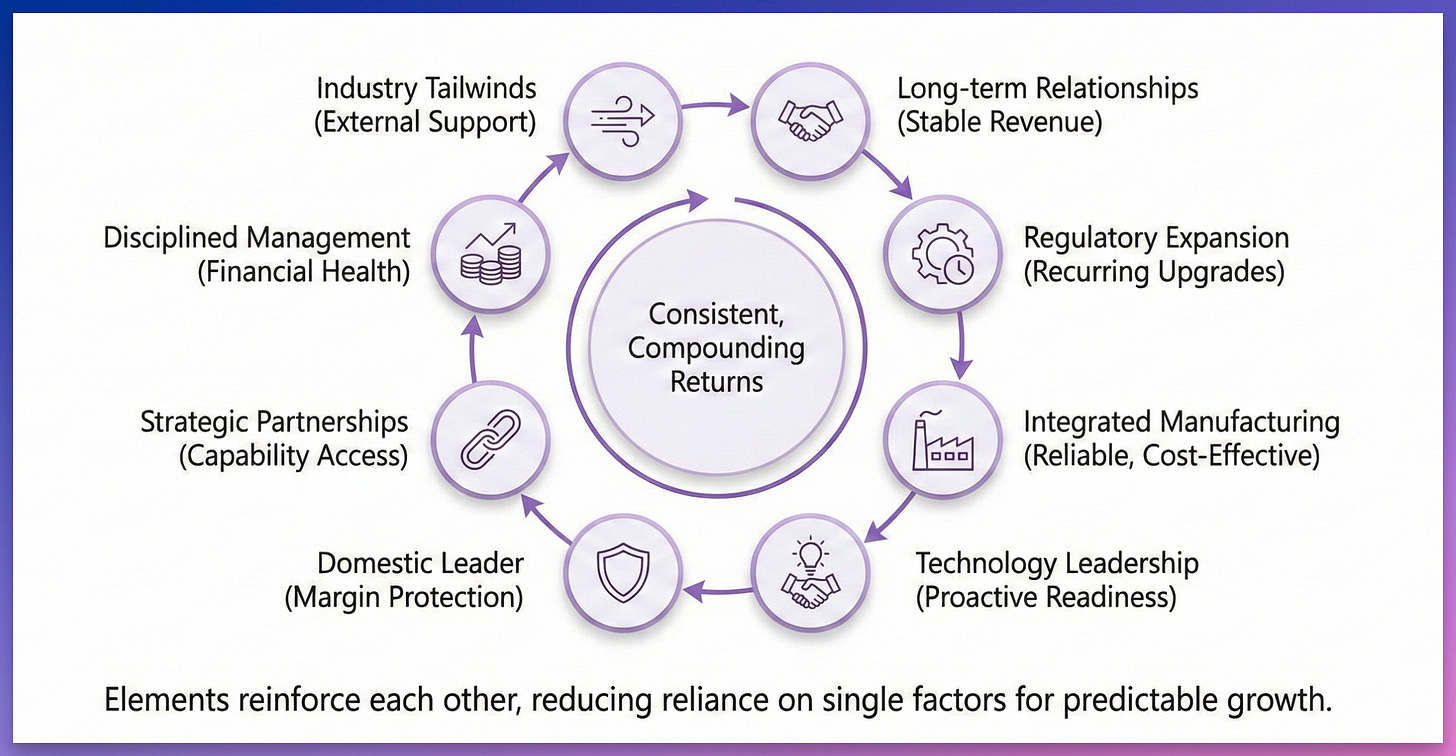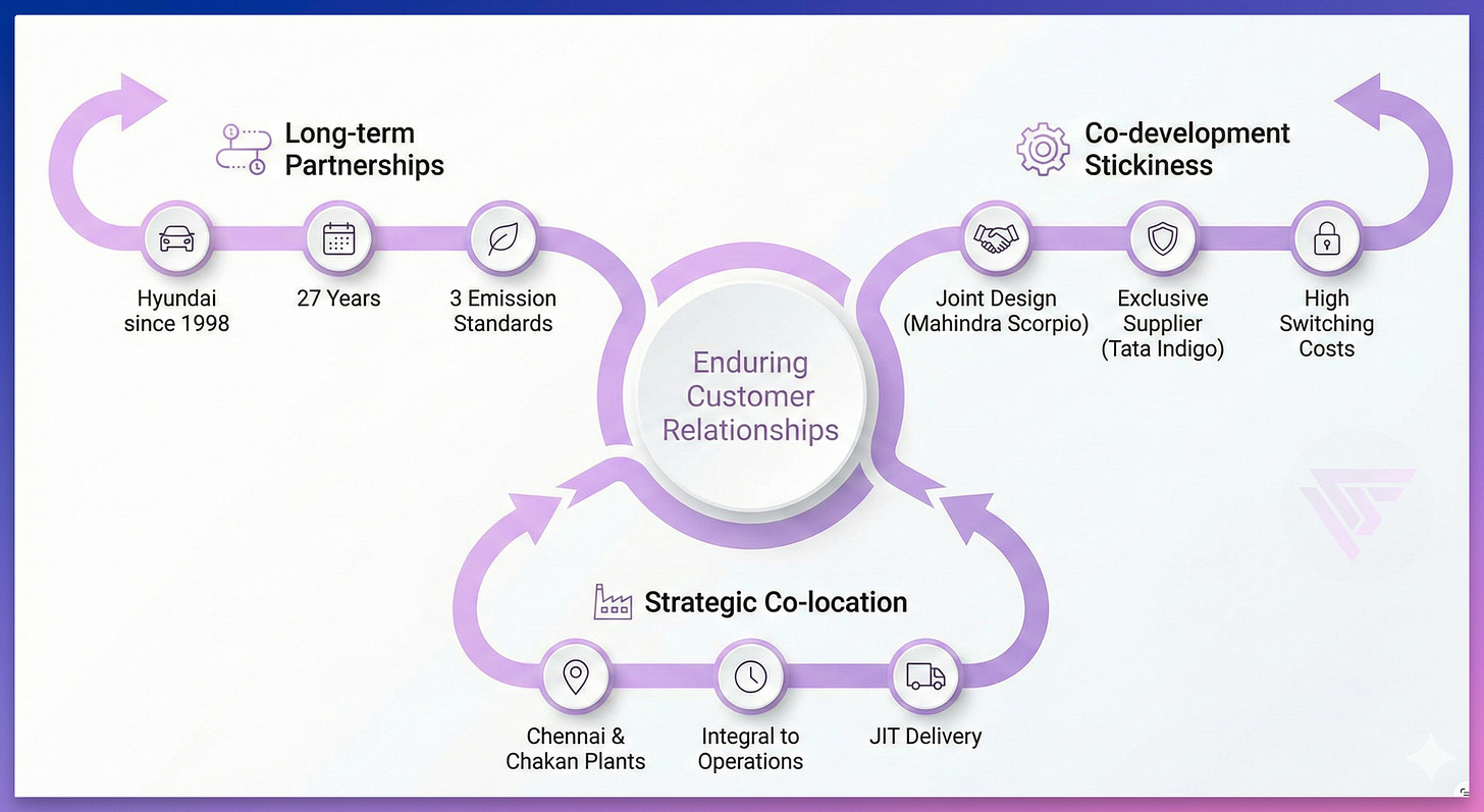 Customer loyalty emerges from co-development partnerships that make switching costly. Sharda jointly developed the Scorpio exhaust system with Mahindra’s engineering team.