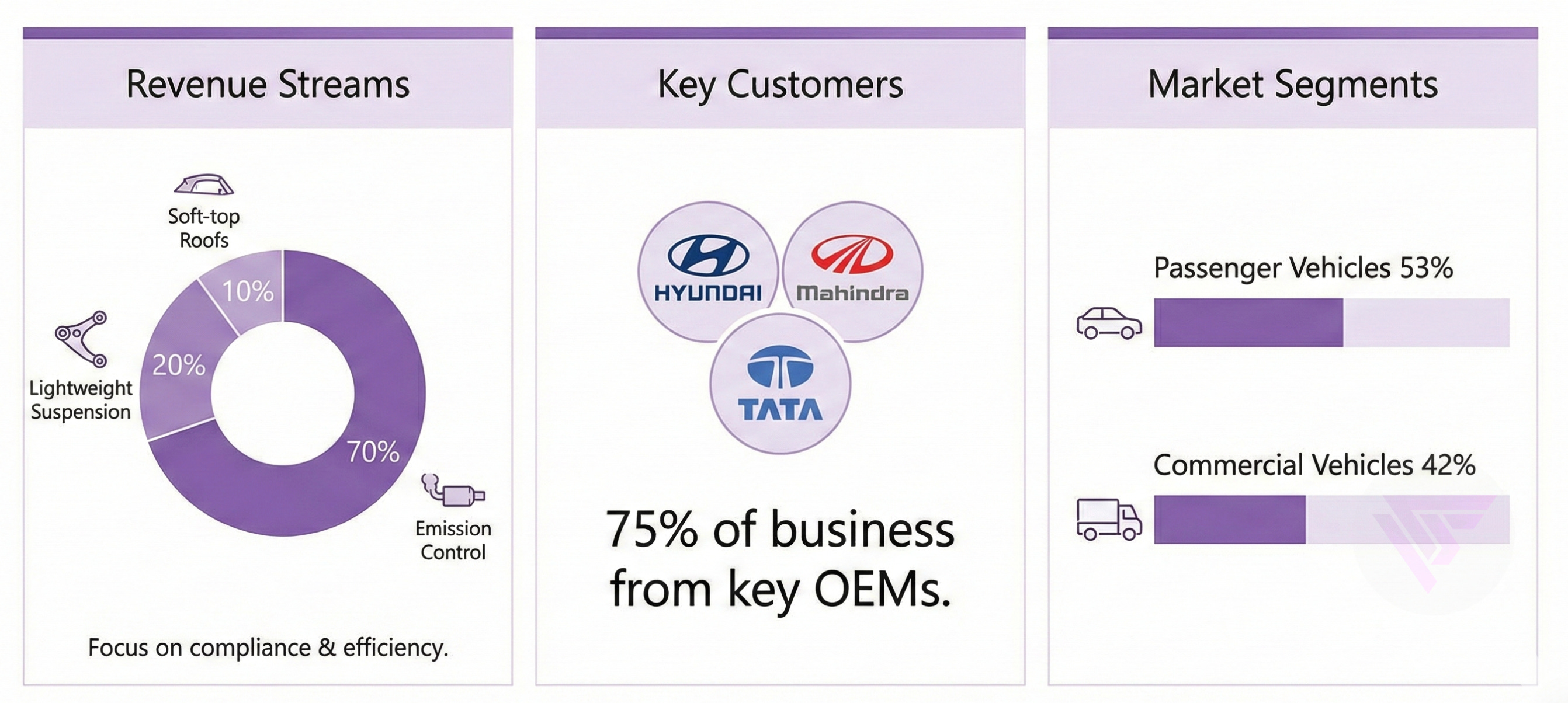 Three customers drive 75% of business: Hyundai Motor India, Mahindra and Mahindra, and Tata Motors.