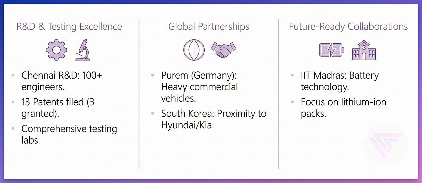 Technical collaborations extend beyond exhaust systems. The partnership with IIT Madras provides battery technology expertise for the Kinetic Green joint venture focused on lithium-ion battery packs.