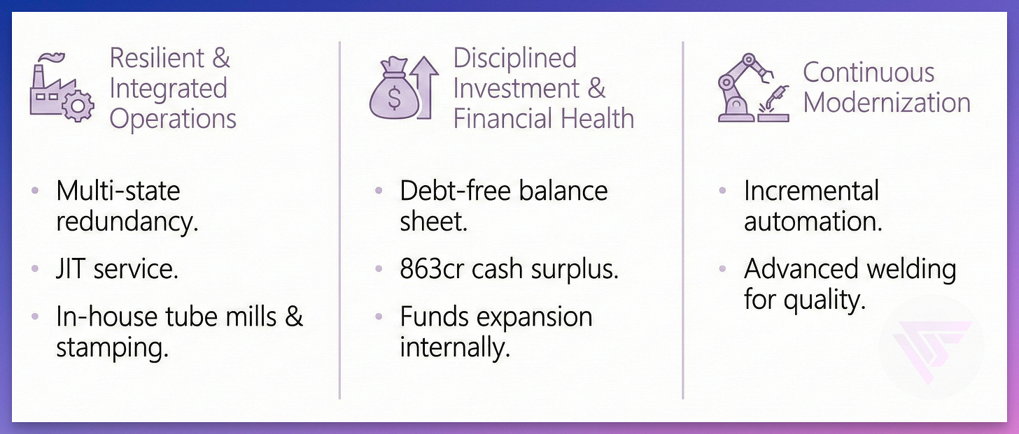 Backward integration provides cost stability competitors cannot match. The company operates its own tube mills at Chennai, producing specialized steel tubes that form exhaust system backbones. The 53 stamping machines handle all critical component production internally.