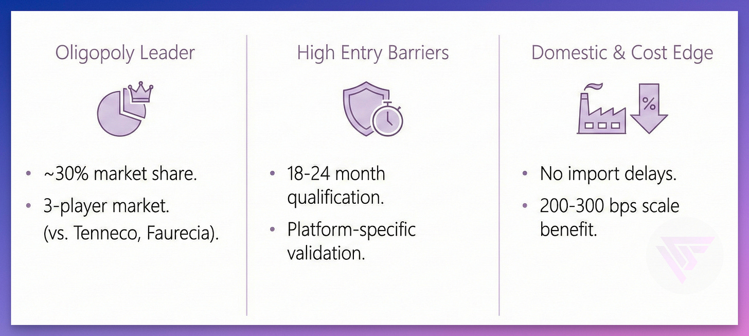 India’s passenger vehicle exhaust market effectively operates as a three-player oligopoly with Sharda holding roughly 30% share. The only competitors are Indian subsidiaries of global multinationals Tenneco and Faurecia.