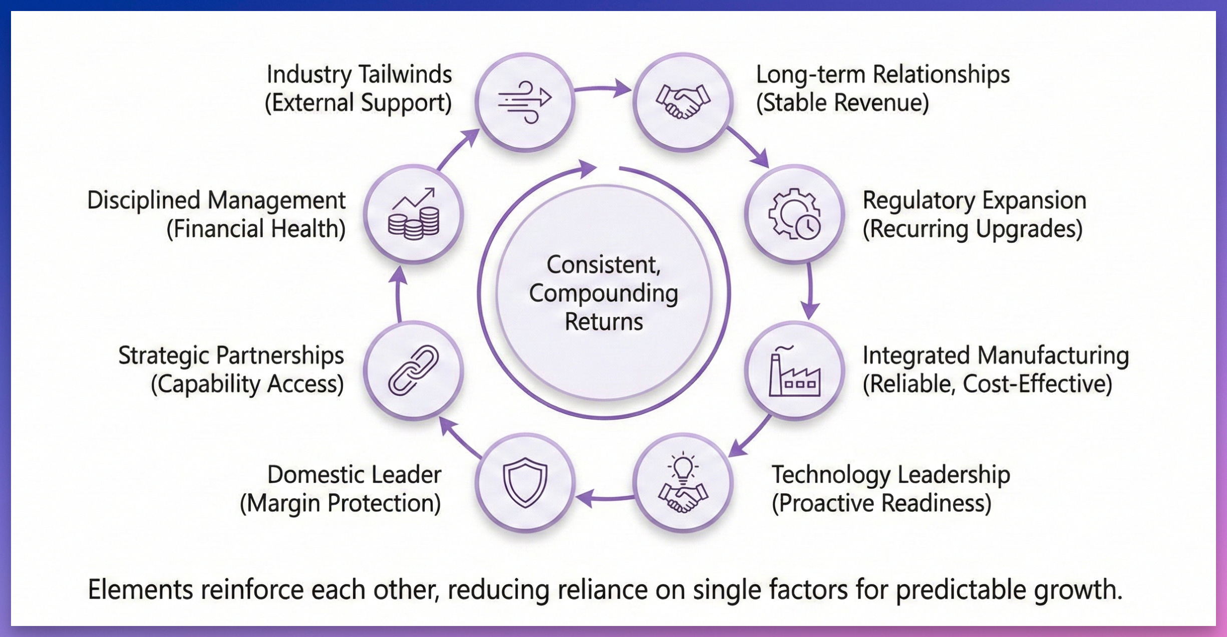 This location-based model has allowed Sharda to capture business whenever emission norms tighten, turning regulatory pressure into predictable revenue growth.