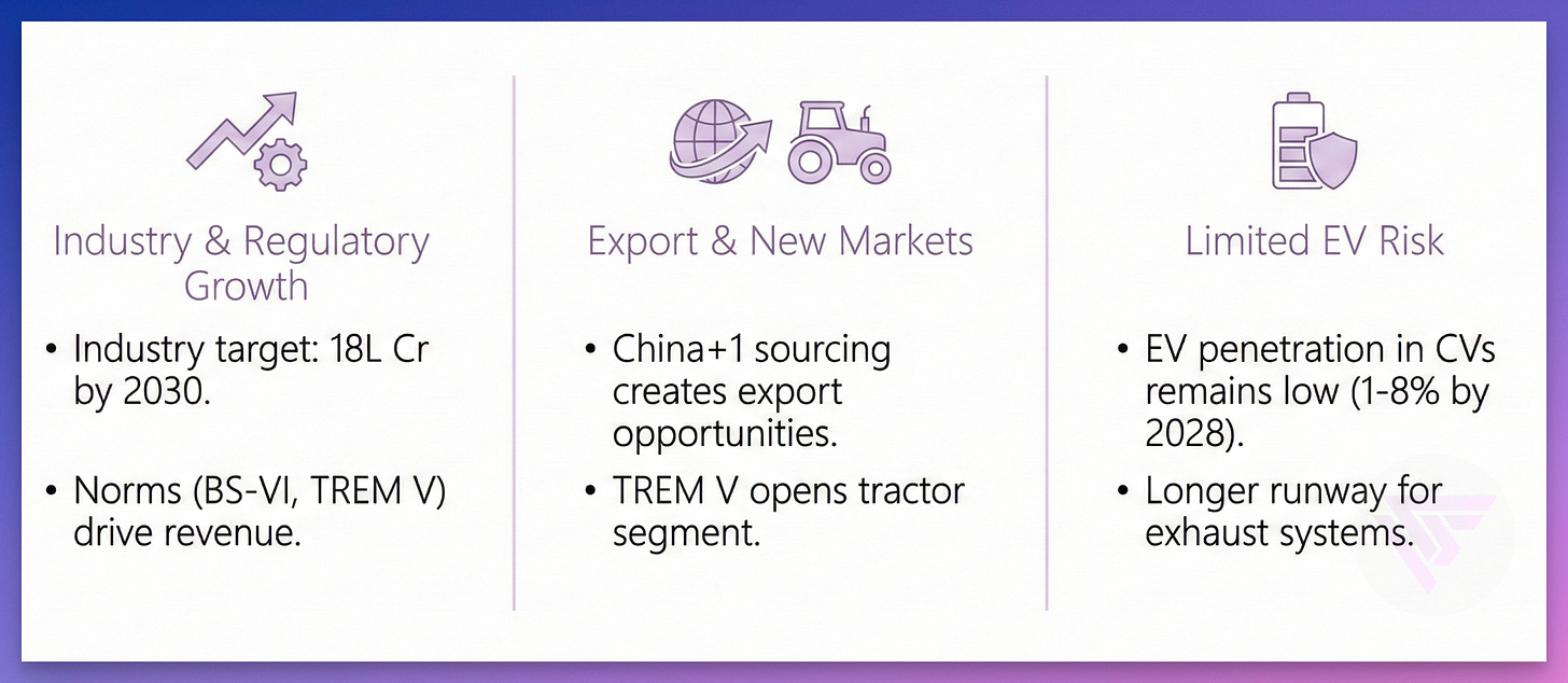 Emission norm transitions represent regulatory tailwinds that arrive on predictable schedules. The BS-VI implementation in April 2020 drove Sharda’s revenue from 863 crore to 2,700 crore over three years.