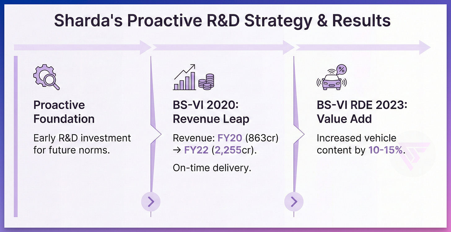 The BS-VI transition in April 2020 demonstrated this strategy perfectly. Revenue jumped from 863 crore in FY20 to 2,255 crore by FY22 in just 3 years as customers awarded business to suppliers that could deliver on time.