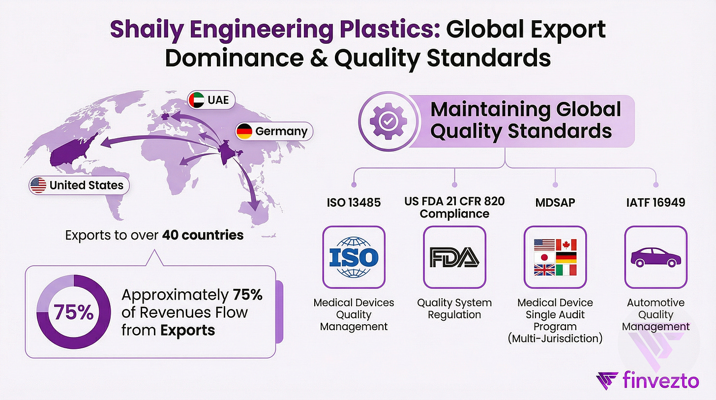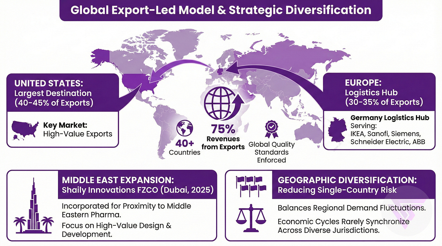 Export-led model with 75% of revenues from 40+ countries forces global quality standards, with United States representing largest single destination at 40-45% of exports.