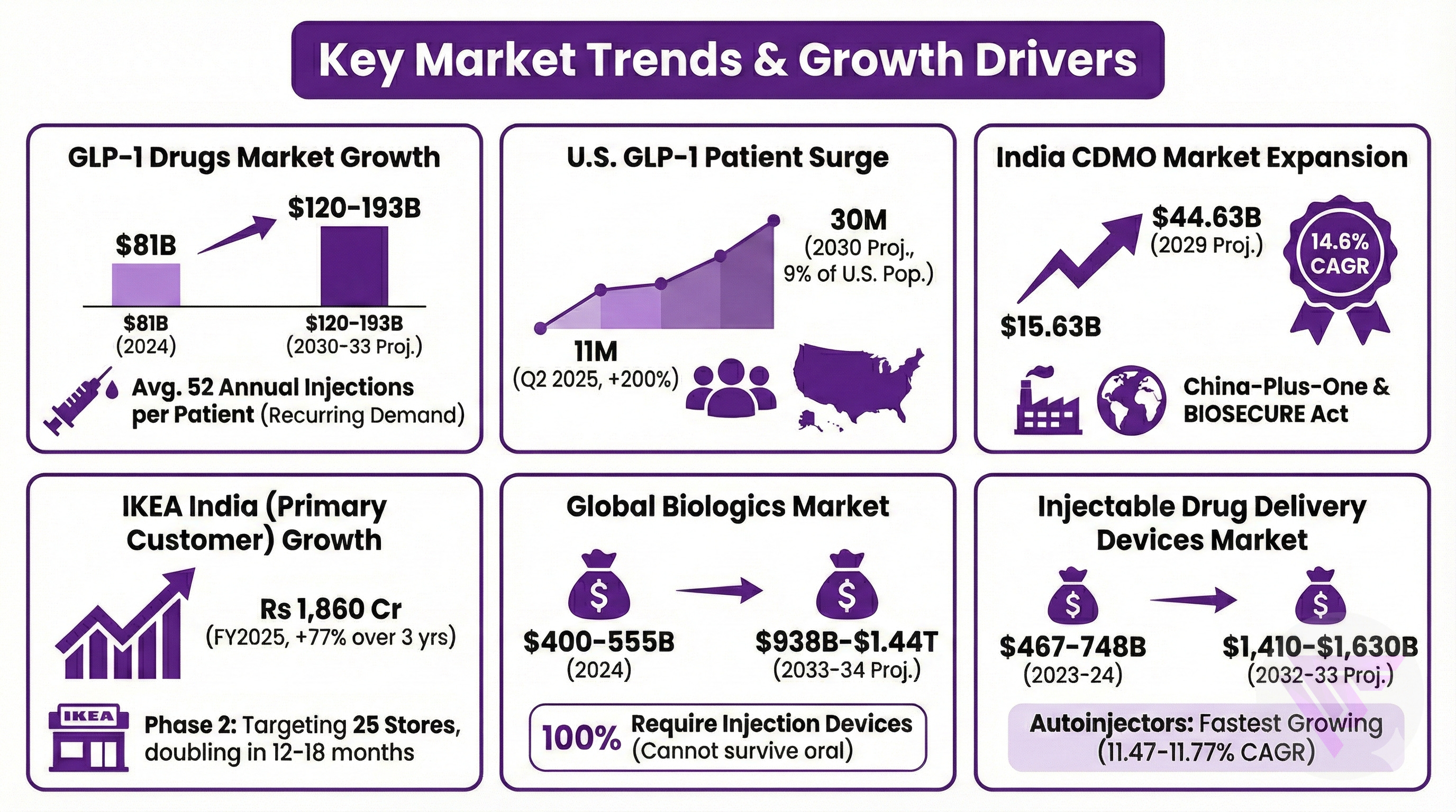 GLP-1 drugs market generated combined $81 billion in 2024 sales, projected to exceed $120-193 billion by 2030-33. With every patient requiring 52 annual injections on average creates recurring demand.