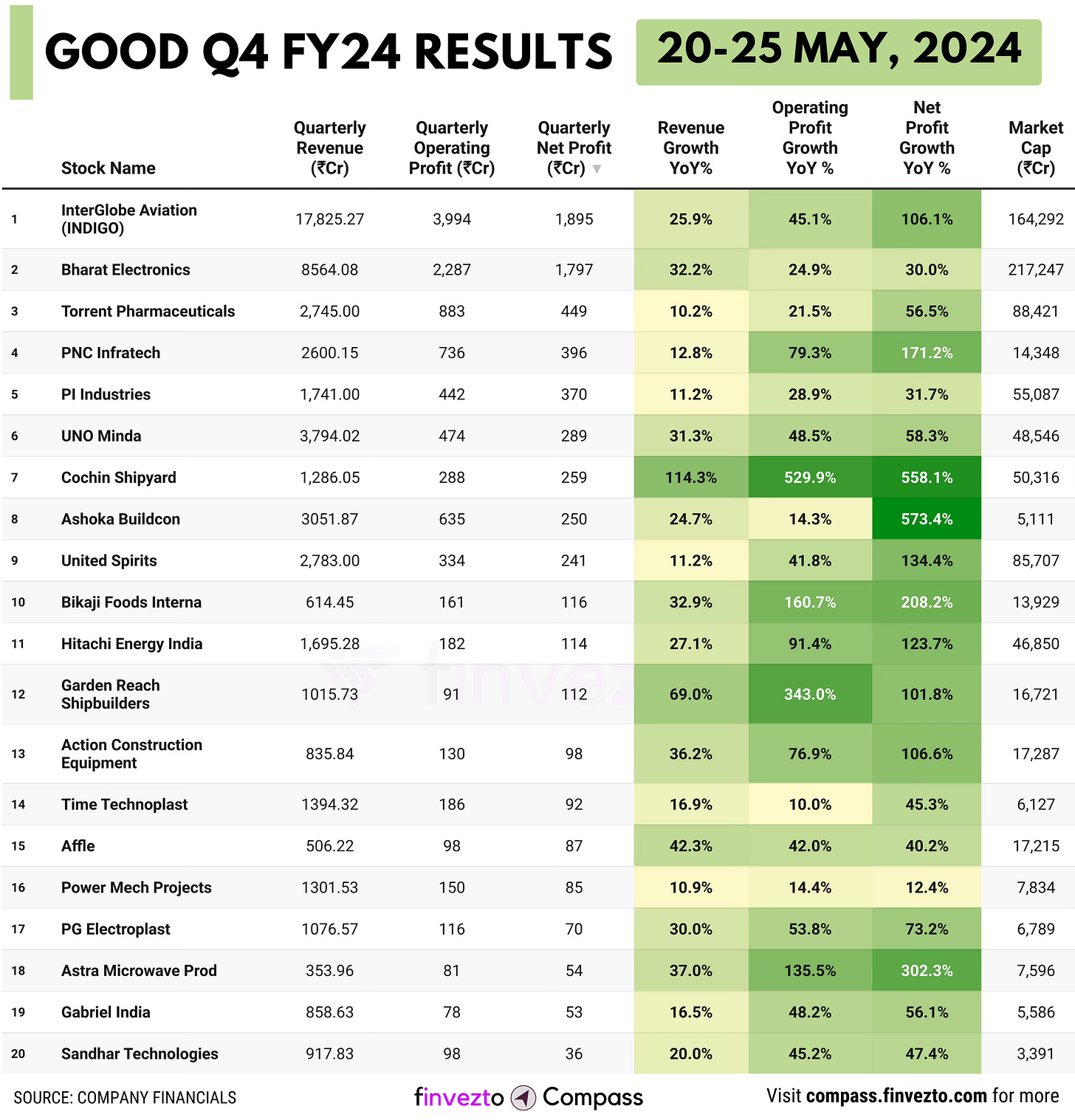 Q4 FY24 Results season is underway and 600+ companies announced their results last week. We have filtered 20 companies that posted good results. These companies have also shown good performance in the previous quarters. Here’s the list.