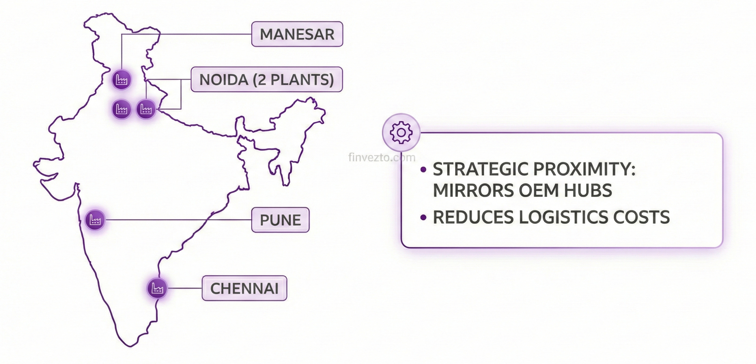 Subros operates 7 manufacturing plants across India. 2 in Noida, and 1 each in Manesar, Pune, Chennai, Nalagarh, and Karsanpura. These locations represent the automotive manufacturing hubs of major OEM customers maintaining proximity.