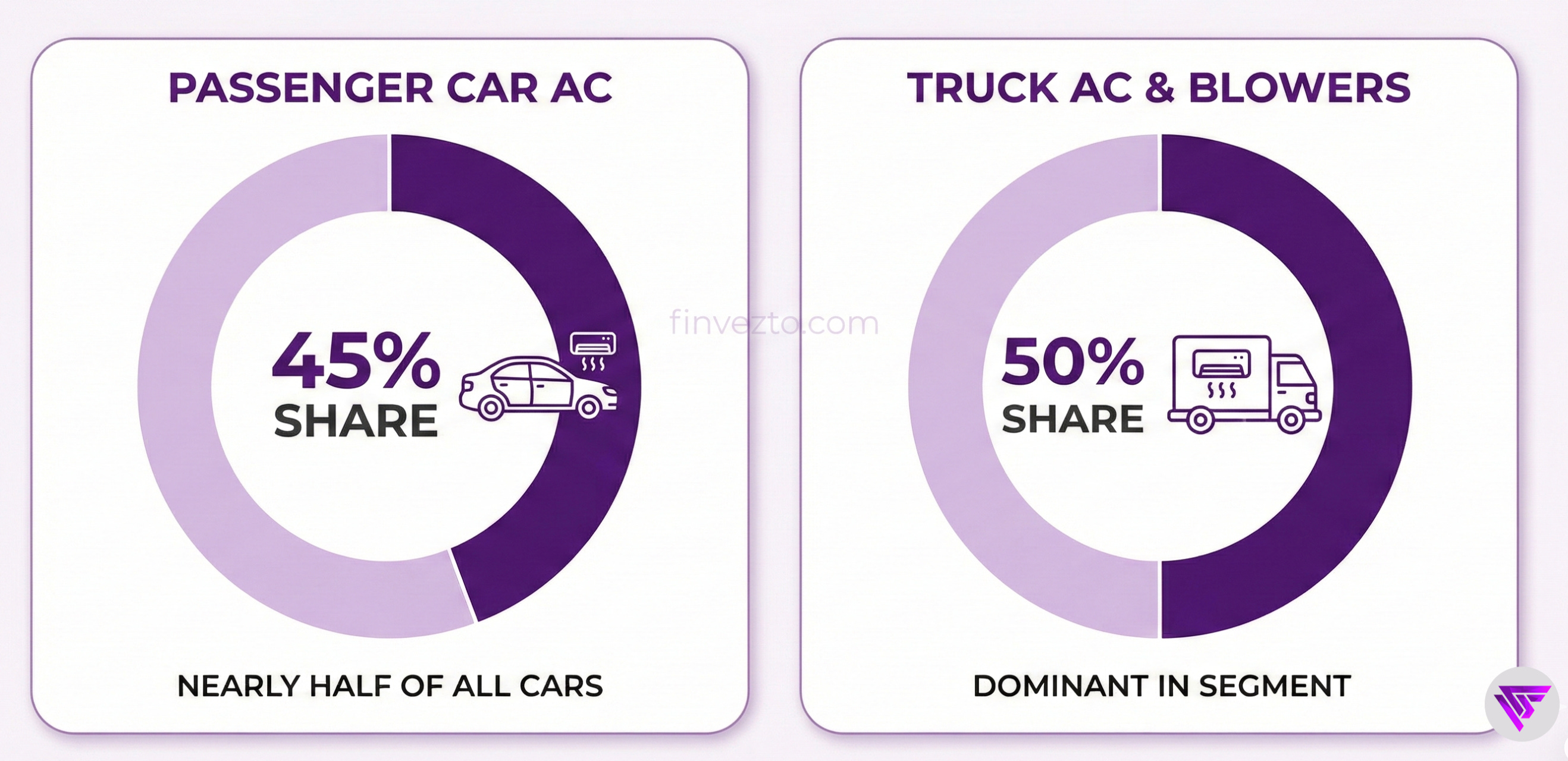 Subros commands ~45% market share in the passenger car AC segment. This means nearly half of all cars sold in India are cooled by a Subros system. In the truck air-conditioning and blower segment, Subros is even more dominant, holding ~50% market share.