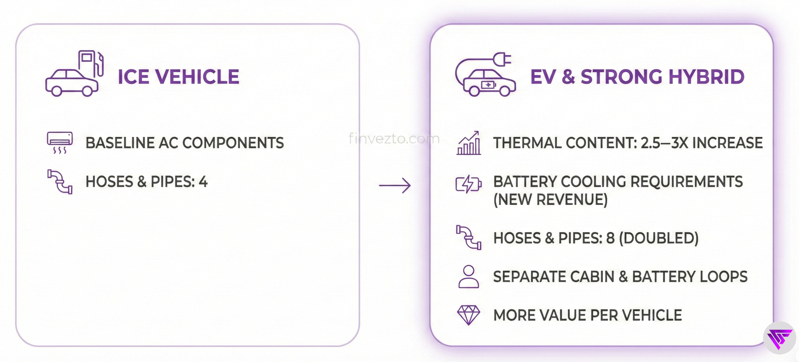 Hose and pipe requirements double from 4 in ICE vehicles to 8 in EVs due to separate cooling loops for cabin and battery. More value captured per vehicle.