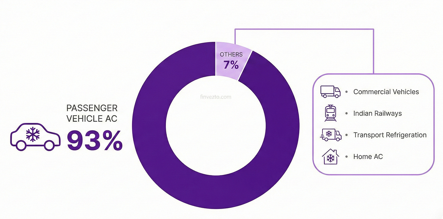 Revenue composition tilts heavily toward passenger vehicle AC systems at approximately 93%, with the remaining 7% split across commercial vehicles, Indian Railways, transport refrigeration, and home AC.
