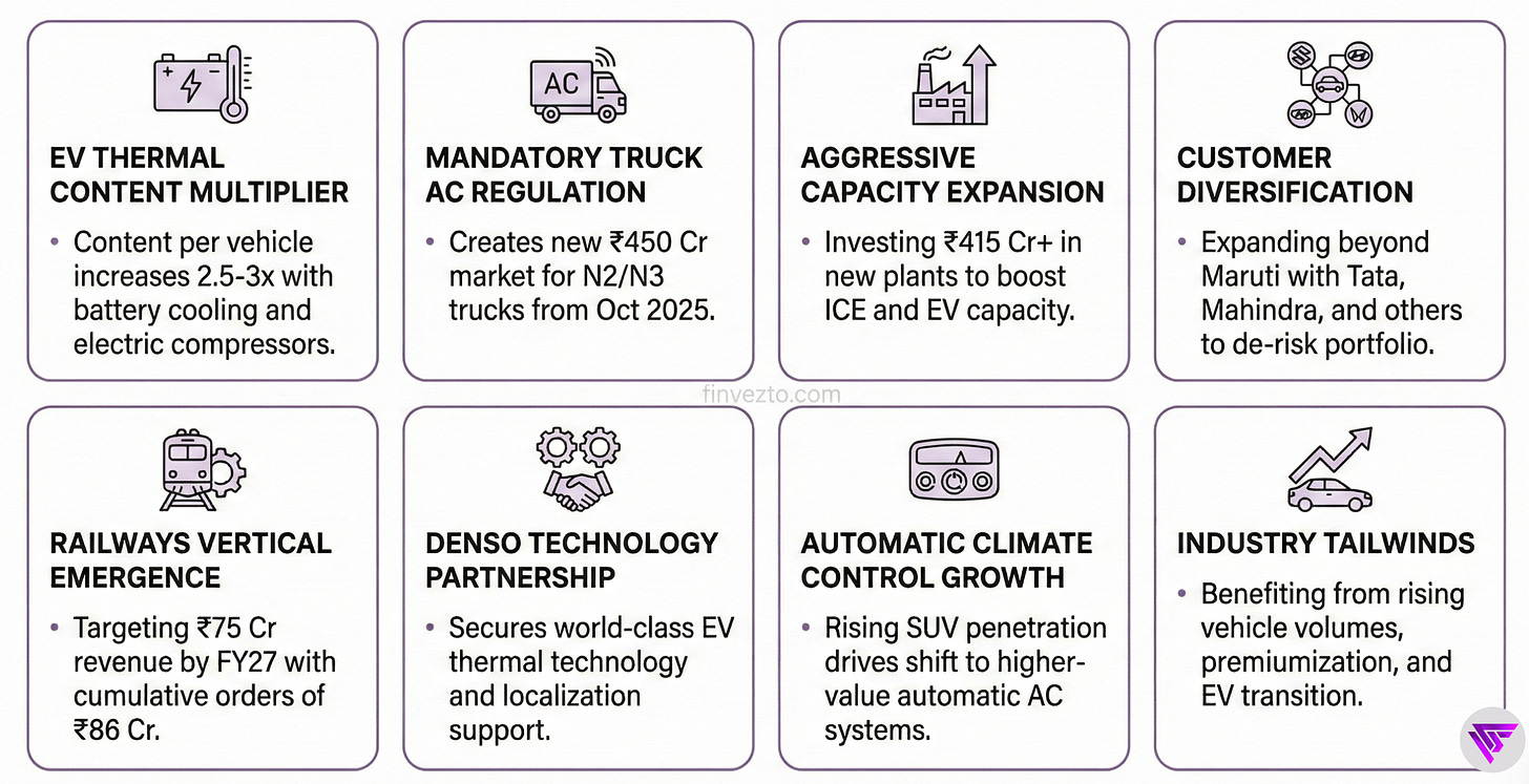 Subros sits at intersection of rising vehicle volumes, increasing AC penetration, premiumization toward automatic climate control, and EV thermal content multiplication. Multi-layered growth drivers.
