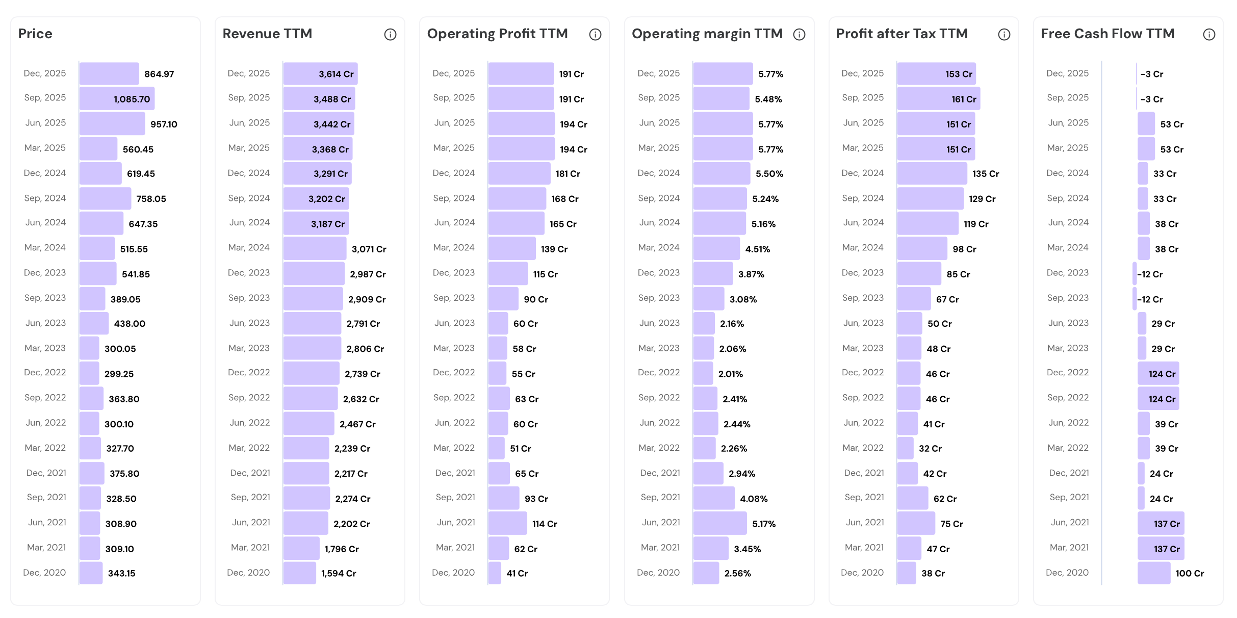 - Revenue has grown 2.3 times (from 1,584 Cr to 3,614 Cr)