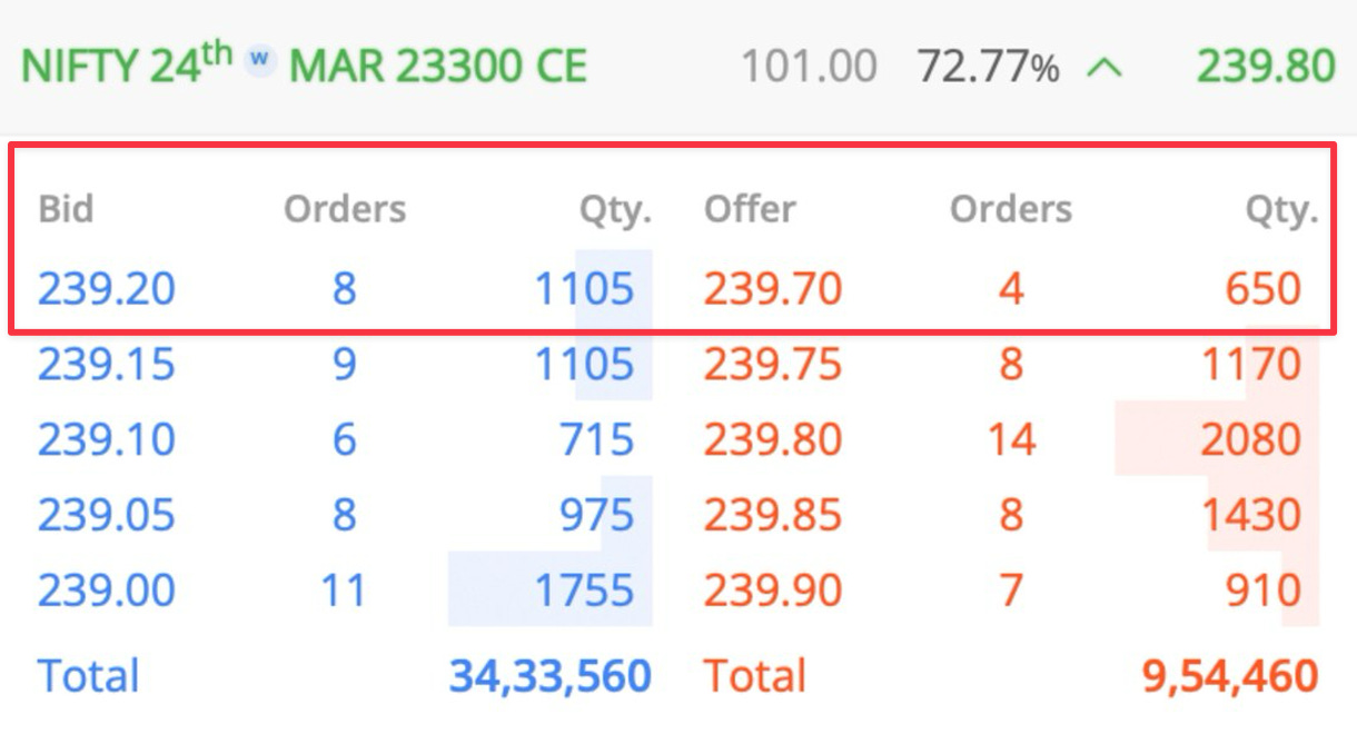 Open any options contract. I have loaded the NIFTY 23,300 call option below. You will see two prices in the market depth. Bid and Offer.