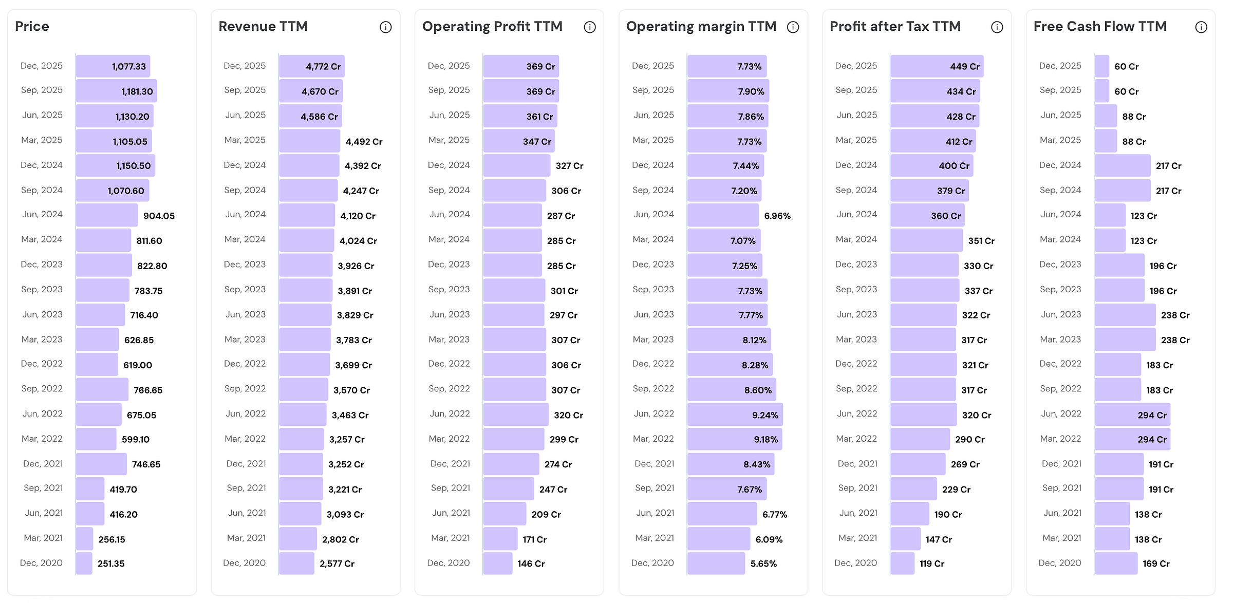 - Stock price has grown 4.3x (from ₹251.35 to ₹1,077.33)