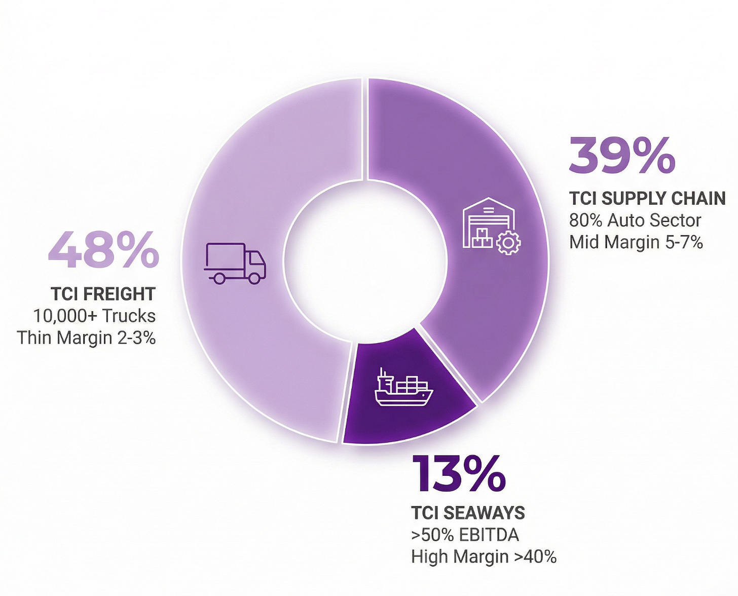 TCI Supply Chain Solutions contributes 39%, providing end-to-end 3PL and 4PL services across 16+ million sq ft of warehousing. The automotive sector accounts for roughly 80% of SCS revenue. Supply Chain Solutions has EBIT margins of 5-7%.