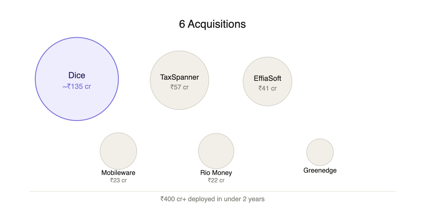Zaggle has deployed IPO and QIP capital to build new capabilities through 6 targeted acquisitions in under 2 years, covering tax filing, UPI infrastructure, enterprise automation, and rewards. Each acquisition adds a monetization layer to the existing corporate client base without requiring proportional new client acquisition effort.