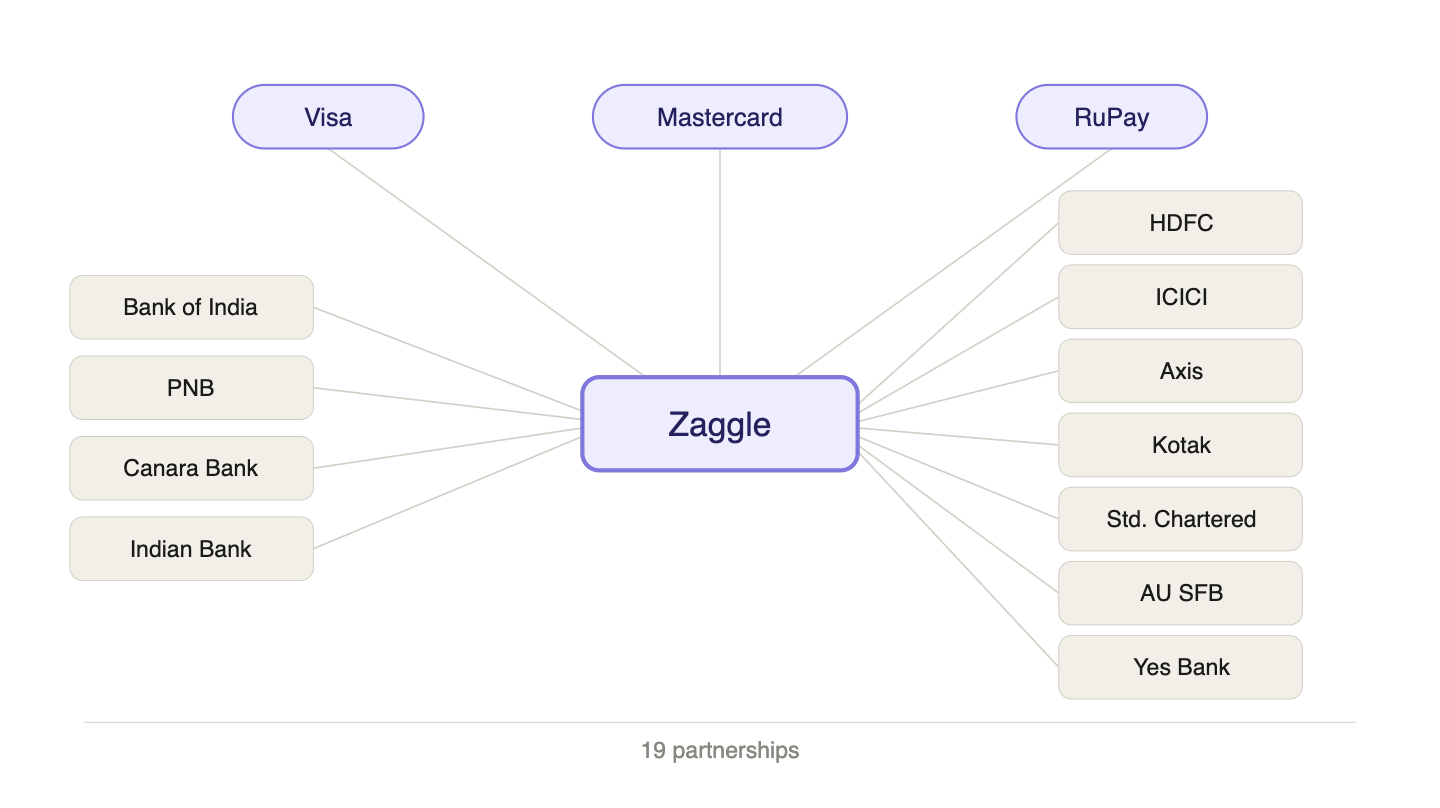 Zaggle maintains 19 banking partnerships alongside Visa, Mastercard, and RuPay tie-ups for card issuance. This infrastructure took over a decade to build.