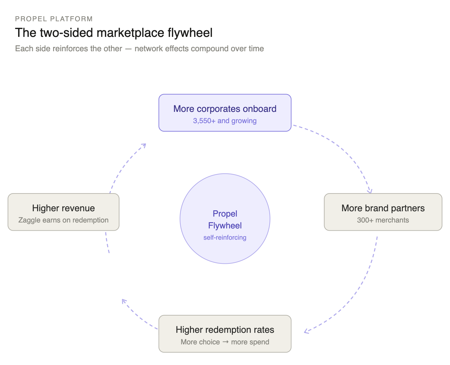 The Propel network creates a reinforcing loop. More merchants make reward points more valuable. More valuable points attract more employees. More employees attract more corporates. The network grows its own value.