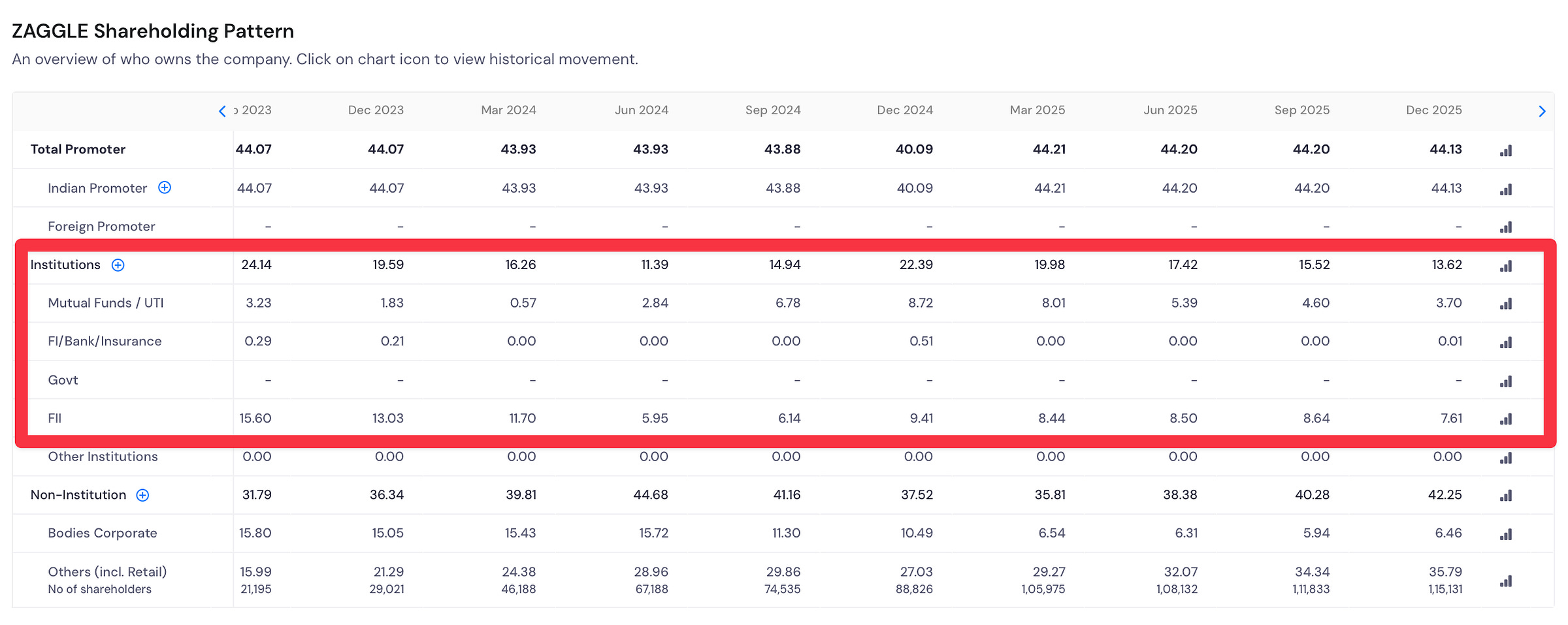 Mutual fund holdings declined from 8.72% in December 2024 to 3.70% in December 2025, a sustained three-quarter institutional selloff. FII holdings also fell from 15% in 2023 to 7.61% in 2025.